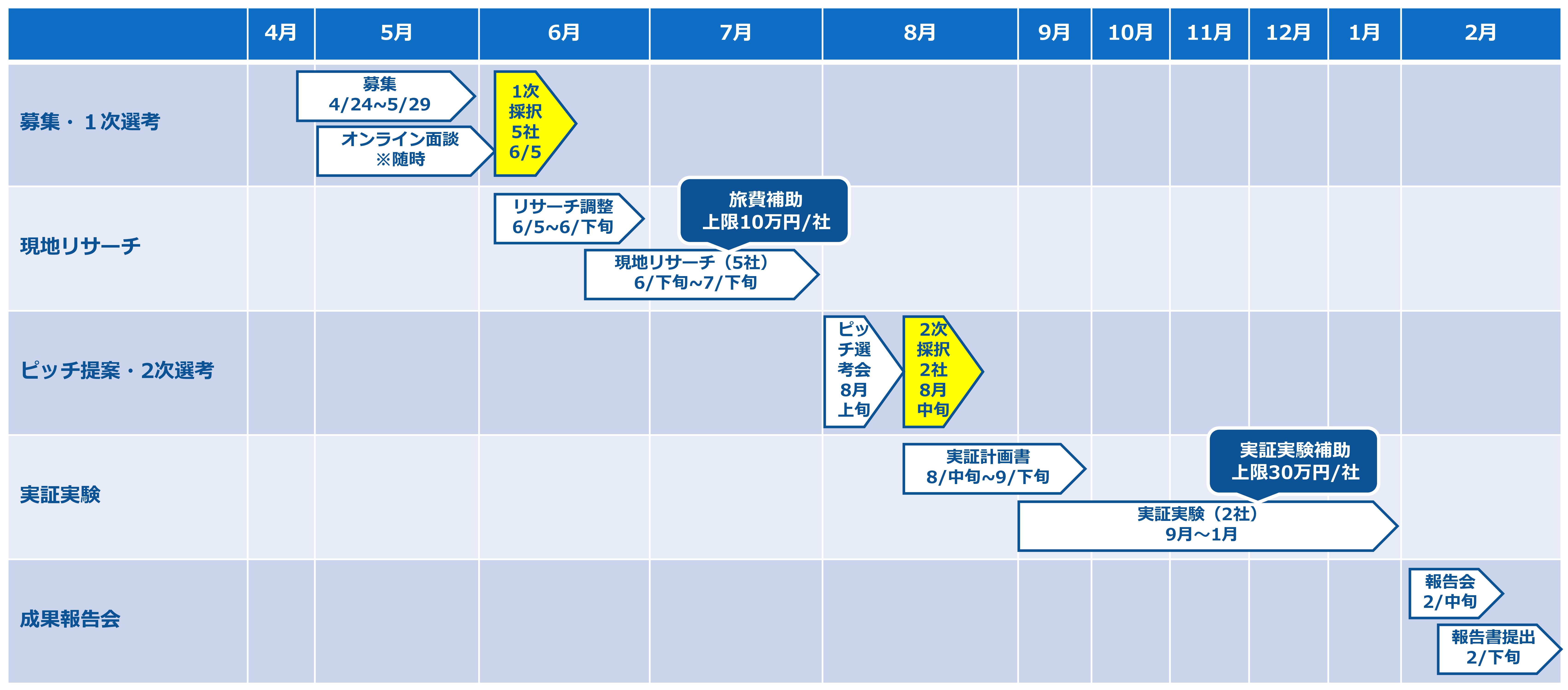 令和8年8月上旬に、現地リサーチなどを踏まえた実証実験内容を提案するピッチ選考会(各社、オンライン形式)を実施します。